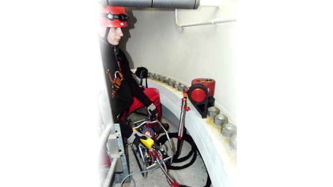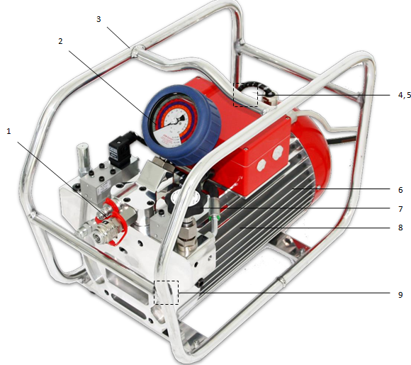 2. High-pressure gauge with protective rubber cover and multiple colored pressure scales (0 – 1000 bar)